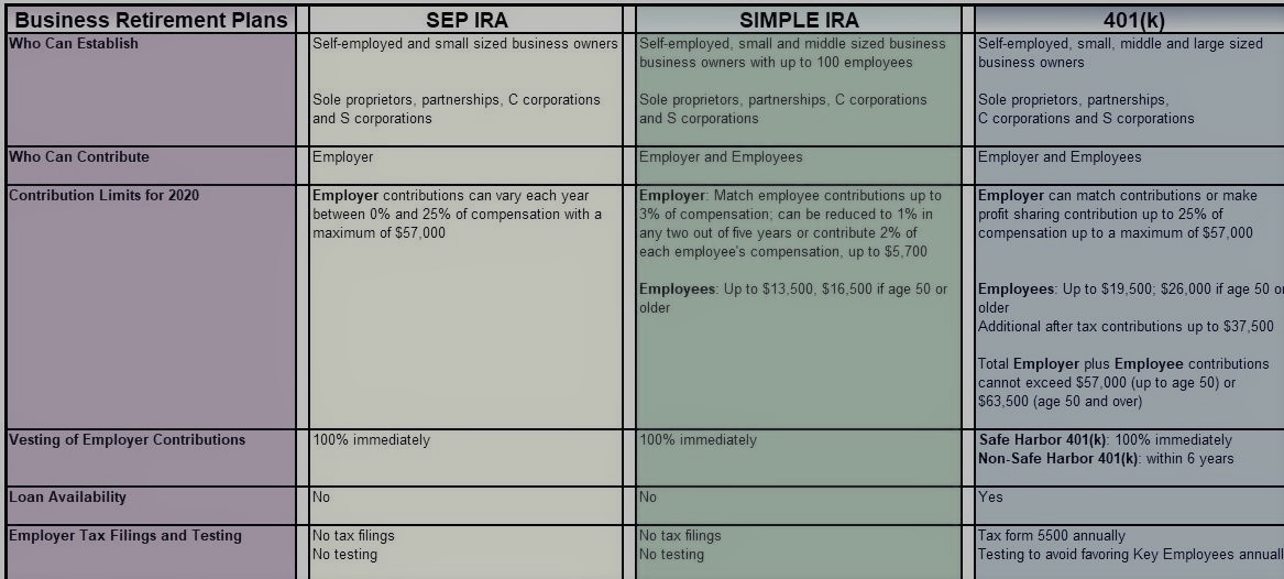 Some of the factors to consider when choosing a plan are affordability, the demographics of your employees, contribution limits and administrative requirements. I am equipped to assist businesses to make informed decisions and set retirement goals. Below is a chart explaining some of the basic details of business retirement plans
