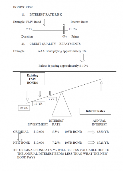 Here is how it works- In the example below, if you owned a $10,000 bond at a 5. 5% interest rate you would be receiving $550 per year in interest payments. When rates rise and new bonds are issued, for example a $10,000 bond at a 7. 5% interest rate paying $750 per year in interest, the original 5. 5% bond will be less valuable because the new bond is simply paying more.